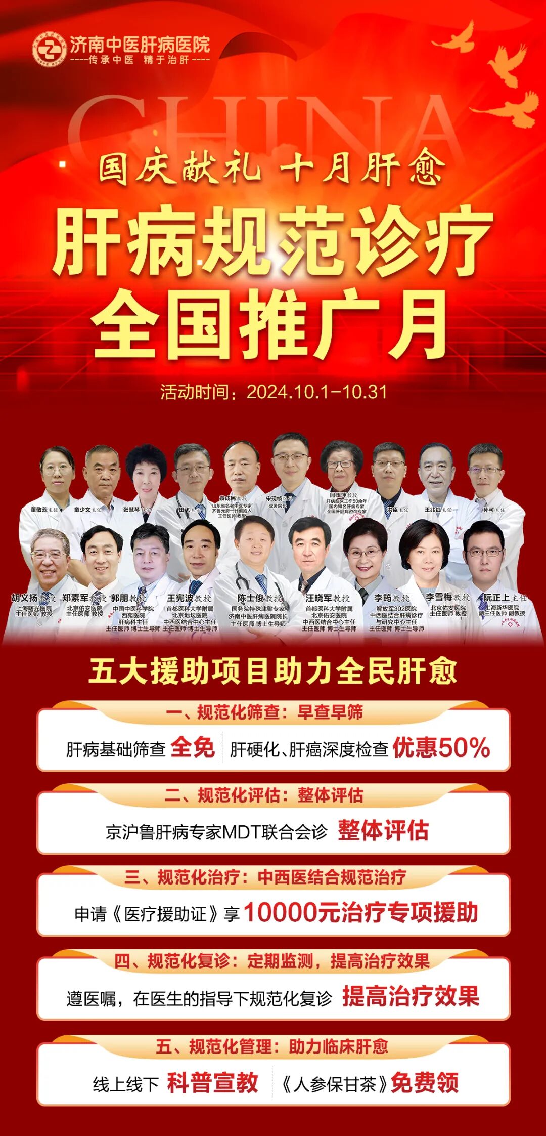 在2024年国庆节到来之际,为献礼国庆,助力肝病规范化诊疗的进程,济南中医肝病医院作为全国肝胆病防治技术示范基地,在北京佑安肝病联盟以及多家医联体单位的支持下,特推出“国庆献礼 十月肝愈 肝病规范诊疗全国推广月”公益活动,为广大肝病患者提供全病程的筛查、诊断、治疗和管理模式!