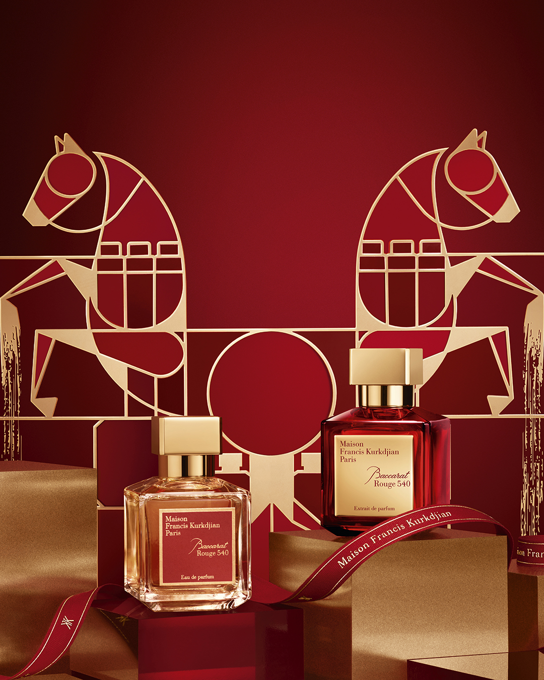 鎏金映红,启幕新岁华章。伴随丙午火马年的到来,梵诗柯香(Maison Francis Kurkdjian)将法式现代美学融入传统吉祥寓意,以充满张力的视觉语言开启新春献礼。调香师弗朗西斯·库尔吉安(Francis Kurkdjian)从骏马所象征的速度与力量中汲取灵感,将这一磅礴的生命力转化为香氛设计的核心符号。瓶身的几何结构与品牌视觉元素解构重组,全新的视觉架构融入双马图案,线条利落而富有节奏,仿佛骏马腾跃而起时的昂扬姿态。深红与鎏金的纯粹对比映射新年的澄亮光影,既是东方节庆的吉庆色彩,也延续法式现代美学的极简精神。双马灵动勾勒出平衡与和谐的构图,如同香气在空间中交织的韵律:既有鲜明的力量,又透着从容的优雅。